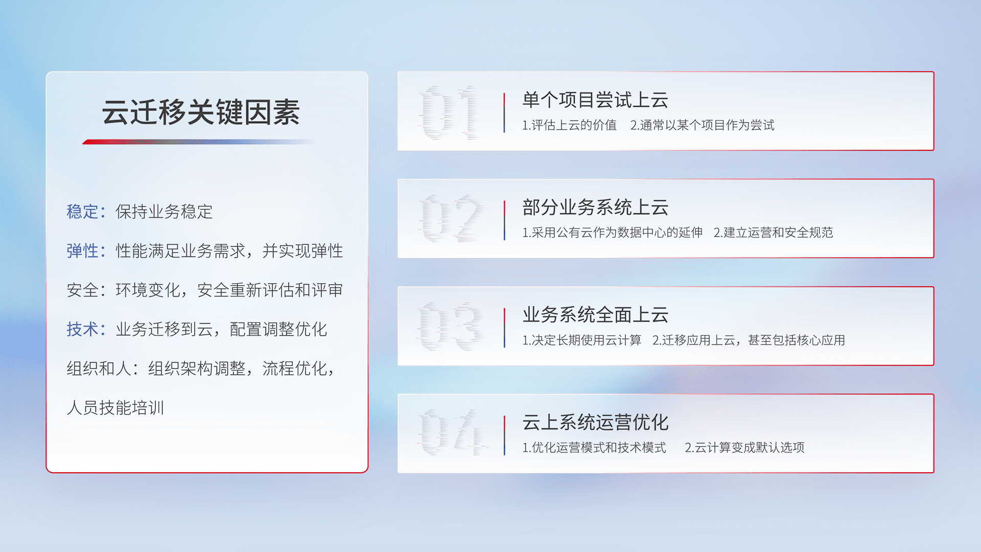 结合实际业务,,从规划设计、、云平台选型、、云原生改造、、、数据迁移、、、、集成交付,,迁移全过程为客户识别最佳上云路径,,,做好风险识别管理,,设计网络架构、、、、身份权限、、、安全审计合规、、操作审计、、、日志审计、、、、监控告警策略、、、多站点容灾设计等,,,对云上基础设施进行整体规划,,,提升IT治理水平,,以满足弹性、、高可用、、、、高性能的需求。。。。